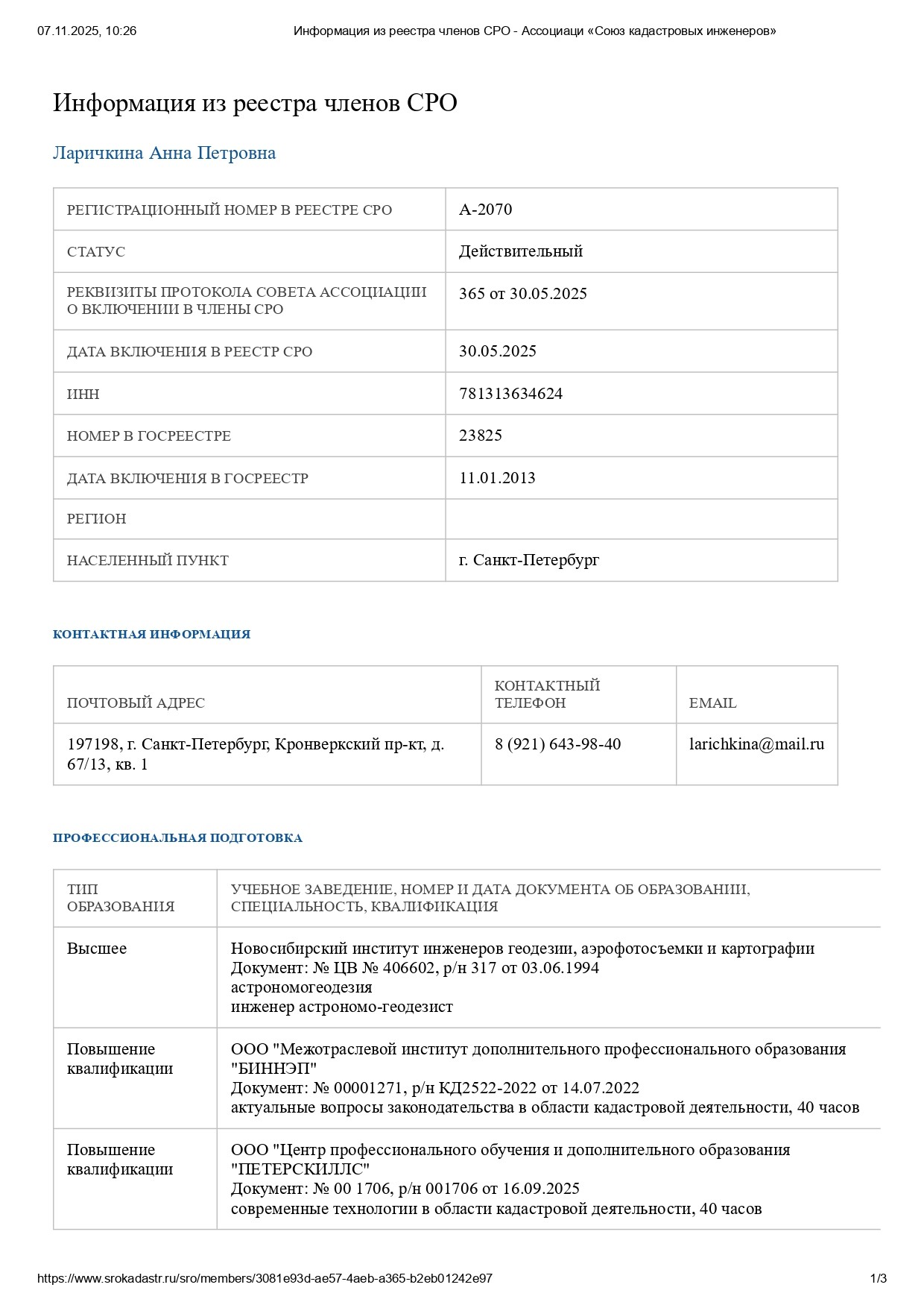 Мой стаж работы кадастровым инженером - более 12 лет, работы по специальности геодезия - больше 30 лет, из них 2 года на государственной службе в Управлении Росреестра по Санкт-Петербургу и опыт работы в Филиале ППК Роскадастр по Ленинградской области
